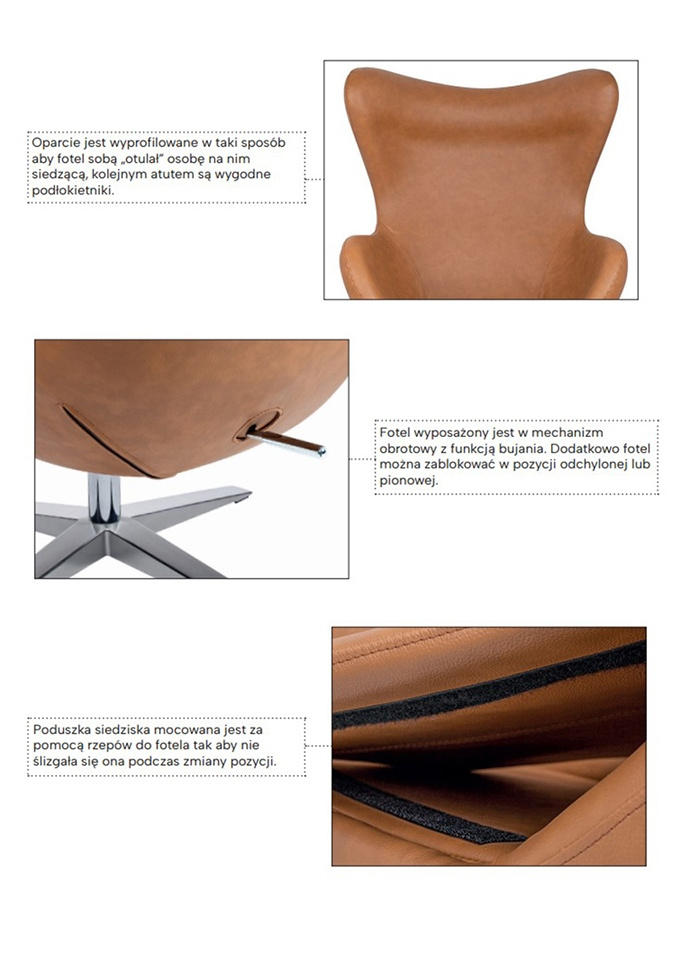 Fotel EGG SZEROKI kształtem nawiązuje do jednego z najbardziej znanych projektów. Fotel wyposażony jest w mechanizm obrotowy z funkcją bujania. Dodatkowo fotel można zablokować w pozycji odchylonej lub pionowej. Ciekawym elementem, jest dekoracyjny suwak na plecach fotela. Fotel tapicerowany jest ekoskórą w kolorze białym. Korpus fotela wykonany jest z metalu. Podstawa oraz uchwyt wykonane ze stali polerowanej. Wymiary: wys. 110 cm / szer. 80 cm / gł. 70 cm Wysokość do krawędzi siedziska: 44 cm Wysokość do podłokietników: 65 cm Waga netto: 22 kg Wymiary opakowania: 78 cm / 83 cm / 110,5 cm Sposób wysyłki: paleta.