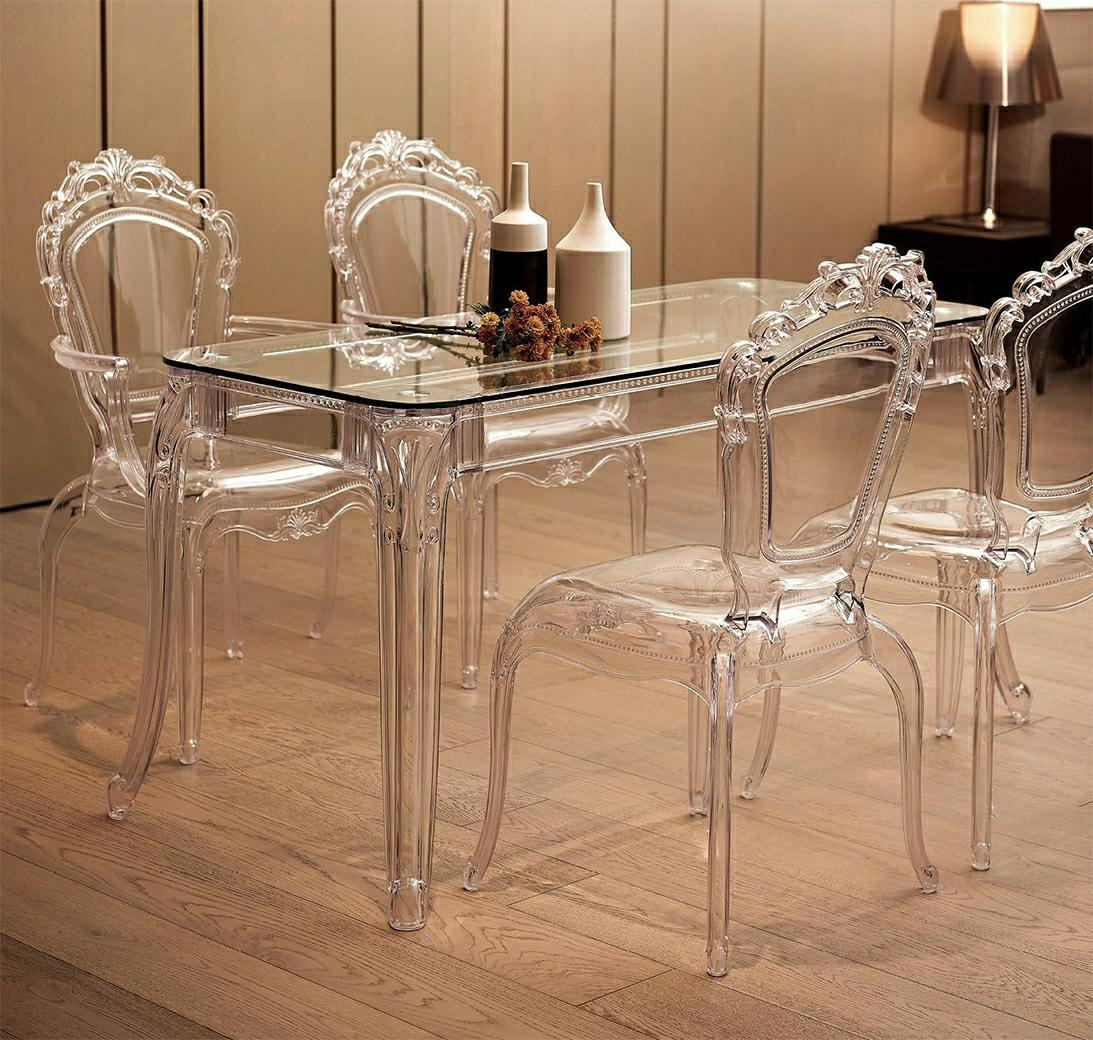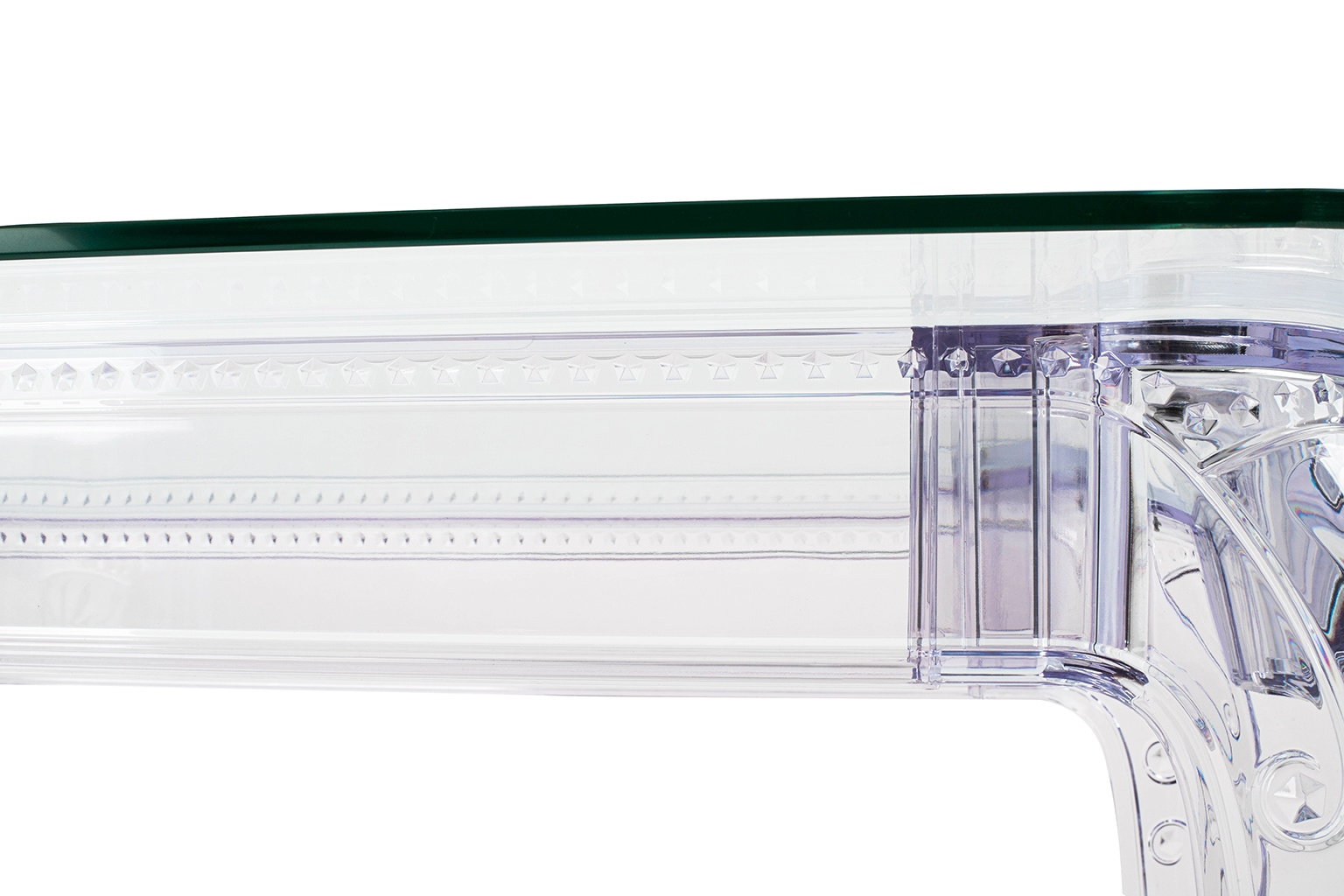 Stół KING 160 transparentny - poliwęglan, szkło hartowane. Połączeniem minimalistycznej formy i wyrafinowanego designu. Blat z grubego, hartowanego szkła przyciąga uwagę eleganckim połyskiem i nadaje całości wyrafinowanego charakteru. Przezroczyste nogi z poliwęglanu, materiału lekkiego, a zarazem wyjątkowo wytrzymałego, tworzą wrażenie przestronności. Transparentna, krystaliczna forma emanuje nowoczesnym blaskiem, tworząc efekt szlachetnej elegancji. Doskonale wpisuje się w style nowoczesny, glamour, minimalistyczny oraz modern classic, dodając im lekkości. Wymiary: wys. 74 cm / szer. 160 cm / gł. 100 cm Blat: szer. 160 cm / gł 100 cm / gr. 1 cm Wysokość do listwy ozdobnej: 62 cm Wysokość listwy ozdobnej: 10 cm Rozstaw nóg: szer. 150 cm / gł. 92 cm / wys. 73 cm.