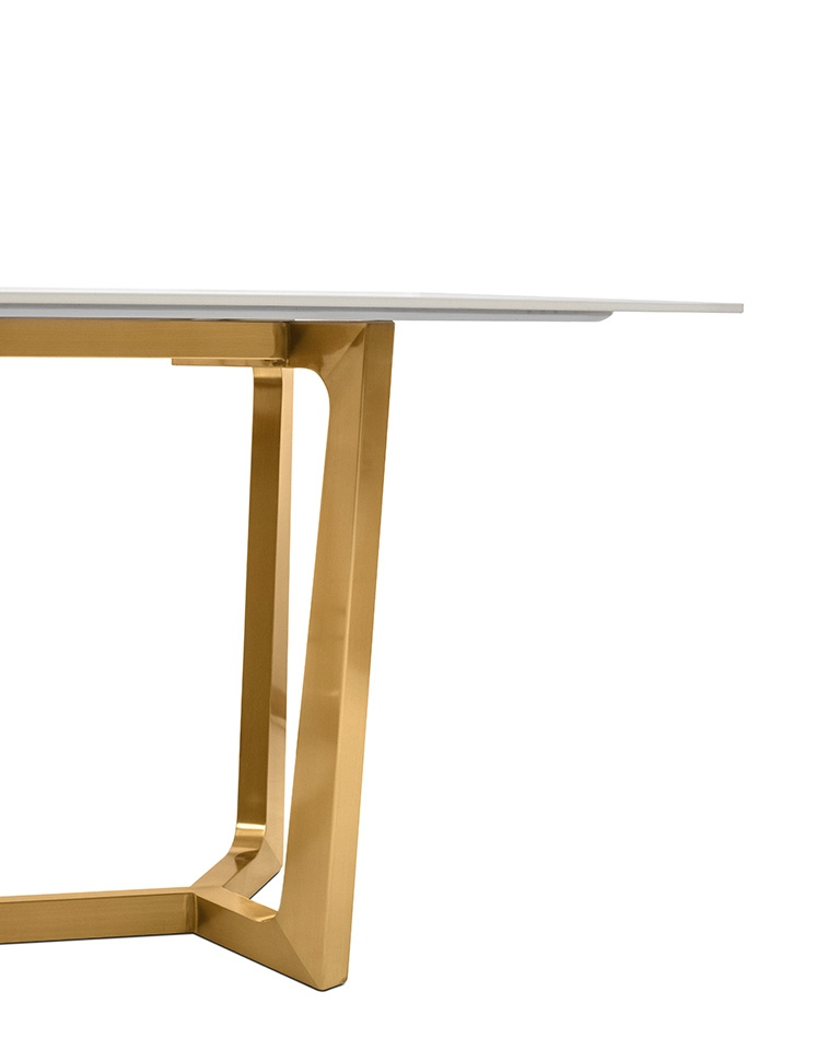 Stół ODEON 180 biały. Kwintesencja nowoczesnego designu połączonego z luksusem. Biały ceramiczny blat imitujący marmur emanuje subtelną elegancją i harmonijnie współgra z imponującą podstawą wykonaną ze stali nierdzewnej w złotym odcieniu. Odeon to stół jadalniany, który doda wyjątkowego charakteru w Twojej jadalni i umili każdy posiłek swoją dostojnością. Dostępna także czarna wersja blatu. Wymiary: wys. 76 cm / szer. 180 cm / gł. 90 cm Blat: wys. 1 cm / szer. 180 cm / gł. 90 cm. Podstawa: wys. 75 cm / szer. 105 cm / gł. 45 cm.