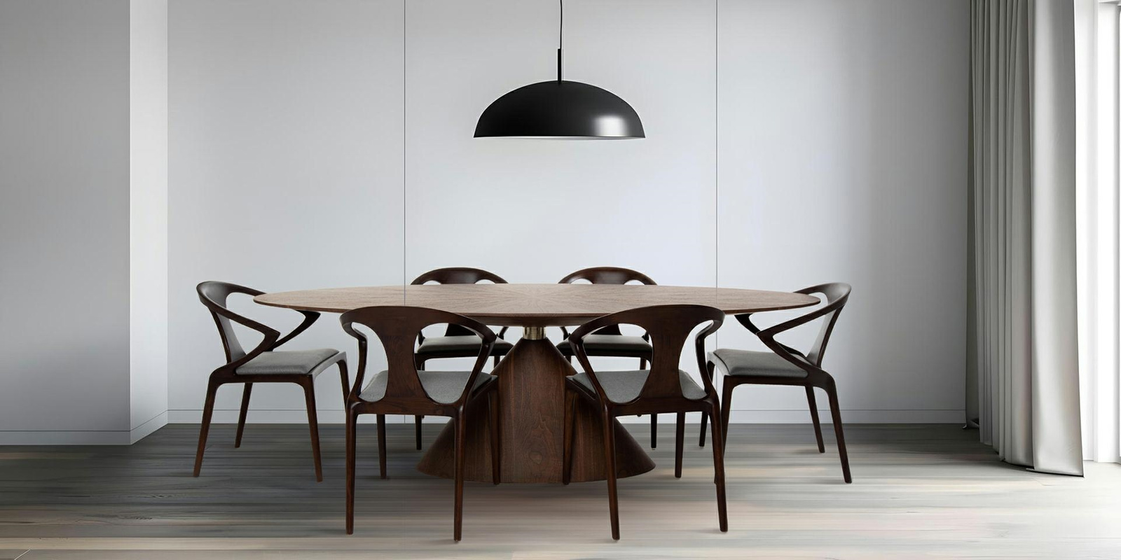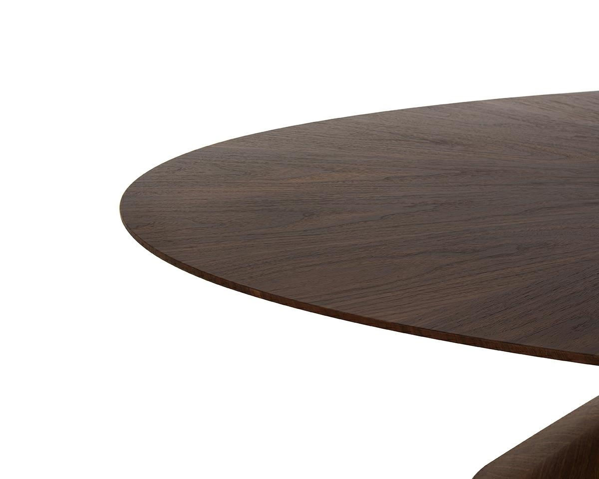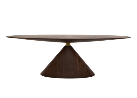 Stół UFO orzech / naturalny fornir. Kwintesencja luksusu i elegancji, która wprowadzi do jadalni wyjątkowy styl. Owalny blat w połączeniu ze stożkowatą podstawą tworzy harmonijną, nowoczesną formę, a złoty element łączący te dwa elementy dodaje wyrafinowanego blasku. Wykonany z naturalnego drewna orzechowego i forniru, stół emanuje ciepłem i naturalnym pięknem, które podkreśla każdy rodzinny posiłek i świąteczne spotkanie. Idealnym dopełnieniem jest krzesło Inez, łączące klasyczny design z nowoczesnym akcentem, wykonane z drewna orzechowego z szarą poduchą, które doskonale komponuje się ze stołem Ufo. Wymiary: wys. 75,5 cm / szer. 240 cm / gł. 100 cm Blat: szer. 240 cm / gł. 100 cm / wys. 10 cm Podstawa: szer. 110 cm / gł. 40 cm / wys. 55 cm.