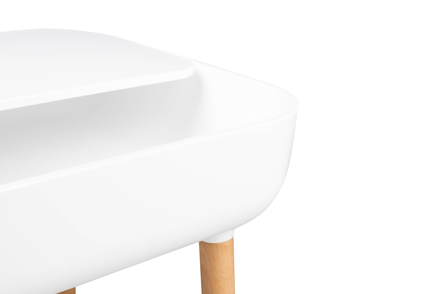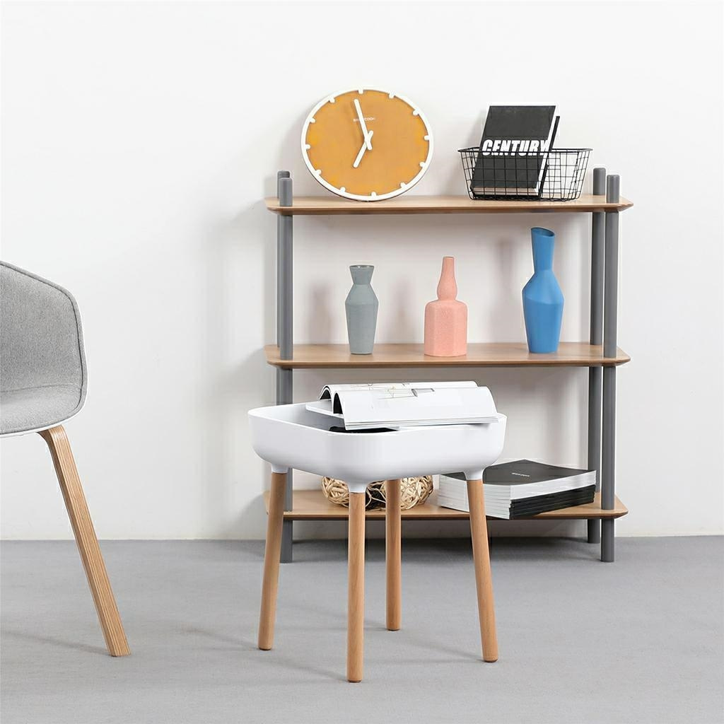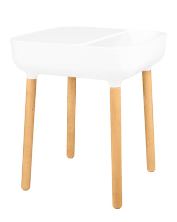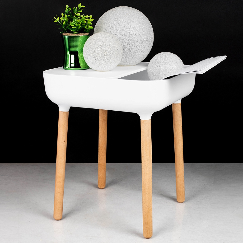 Stolik BOWER biały. Blat z praktyczną półką wykonany został z polipropylenu w kolorze białym z dodatkowym miejscem na przeprowadzenie przewodu, co znacznie ułatwia organizację. Nogi z drewna bukowego sprawiają, że stolik świetnie odnajdzie się w stylu skandynawskim. Wymiary: wys. 47 cm / szer. 39,5 cm / gł. 39,5 cm Blat: gr. 8 cm / szer. 33 cm / gł. 33 cm Półka blatu: 39 cm / 24,5 cm Rozstaw nóg: szer. 33 cm / gł. 33 cm / wys. 35,5 cm Otworu na kabel: śr. 3,5 cm Wymiary opakowania: 41 cm / 41 cm / 13 cm.